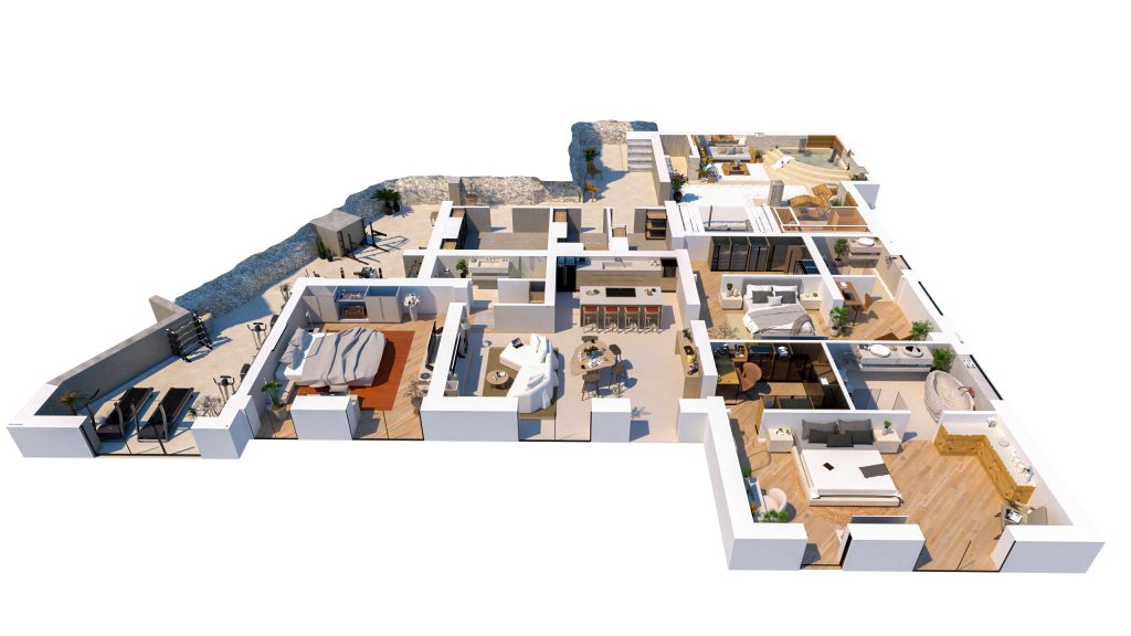 • Interni eleganti e funzionali: la villa dispone di tre camere matrimoniali, di cui una master suite con bagno privato e terrazzo vista mare, un bagno ospiti, una spaziosa zona living con ampie vetrate panoramiche e una moderna cucina open space.