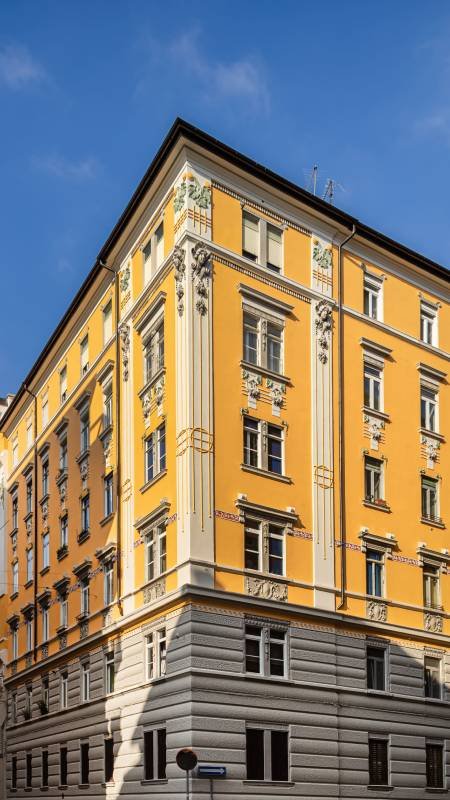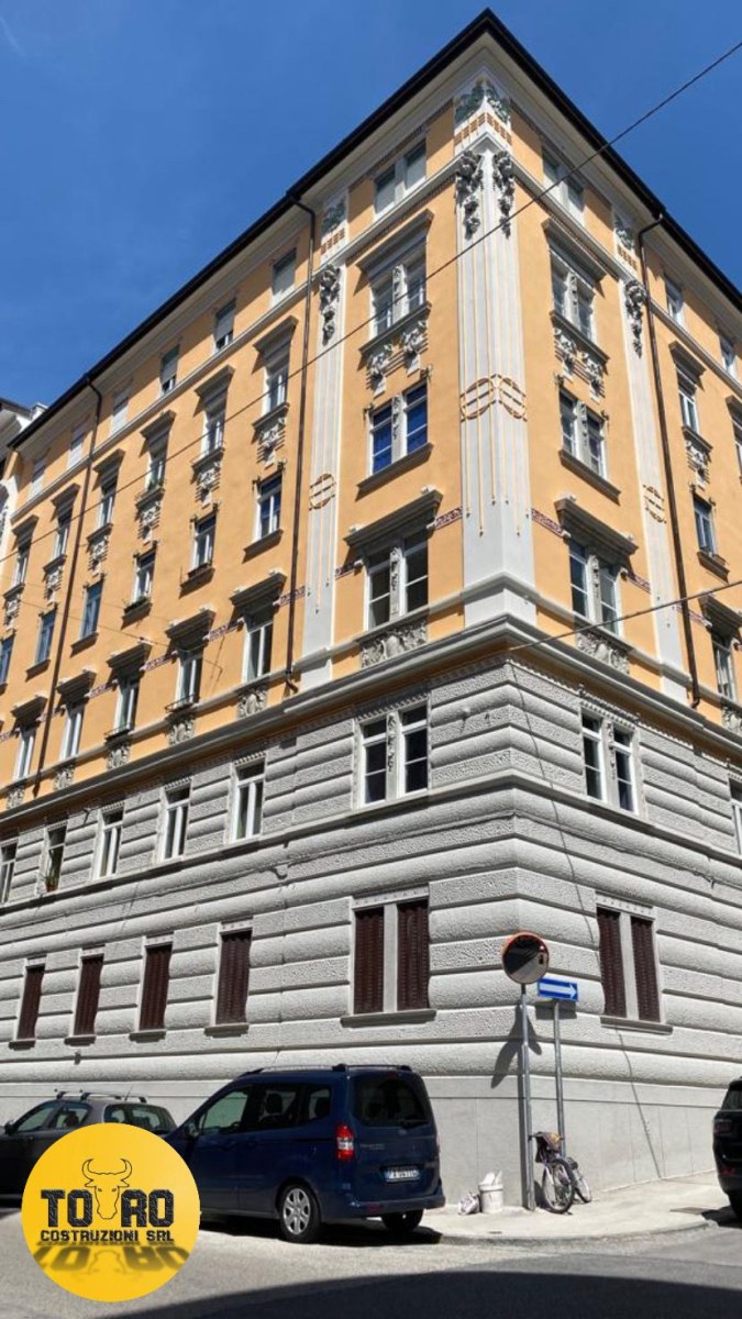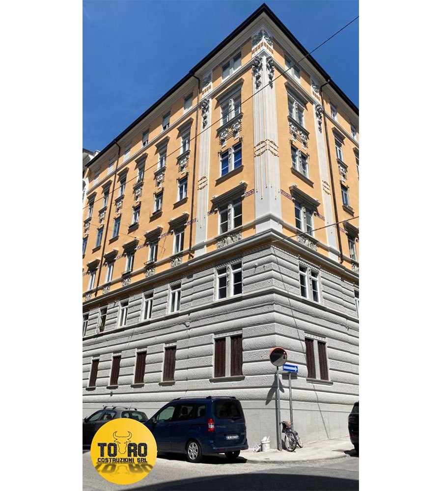 Intervento di restauro e manutenzione di una facciata storica con particolare cura nella ricostruzione dei decori architettonici e nell’idrosabbiatura delle parti lapidee.